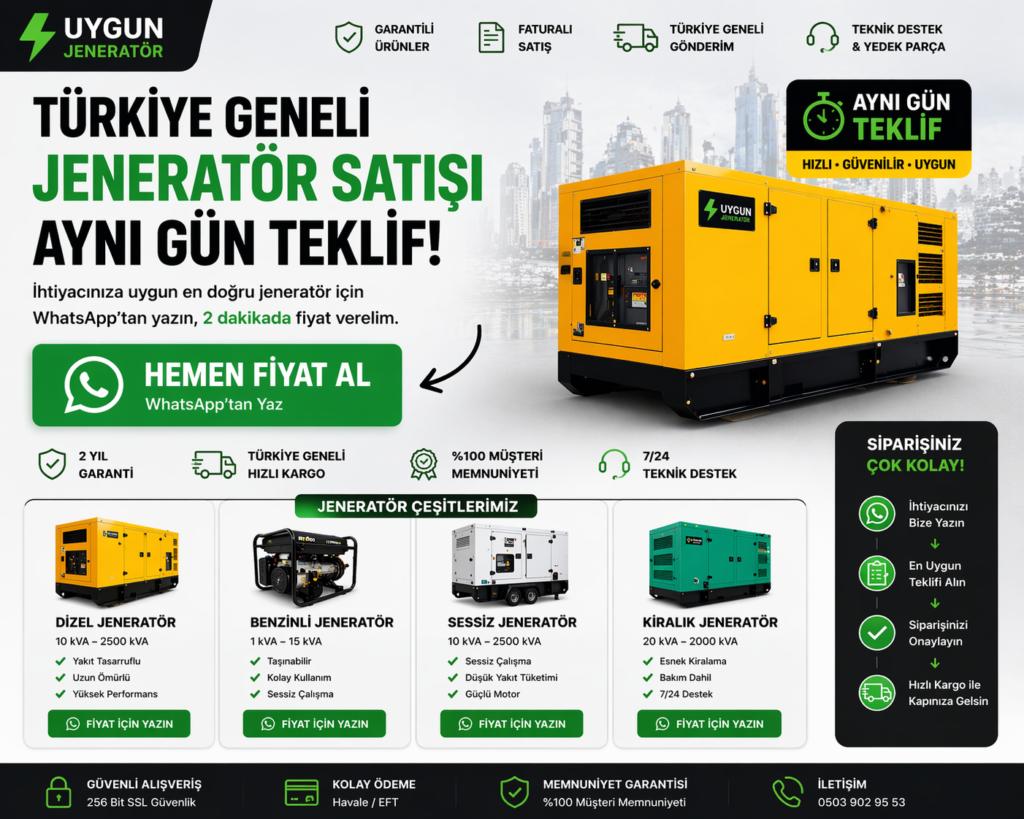 Türkiye genelinde uygun fiyatlı ve garantili jeneratörlerimizi keşfedin; hızlı teslimat ve güvenilir destekle ihtiyacınız olan gücü hemen sağlayın.